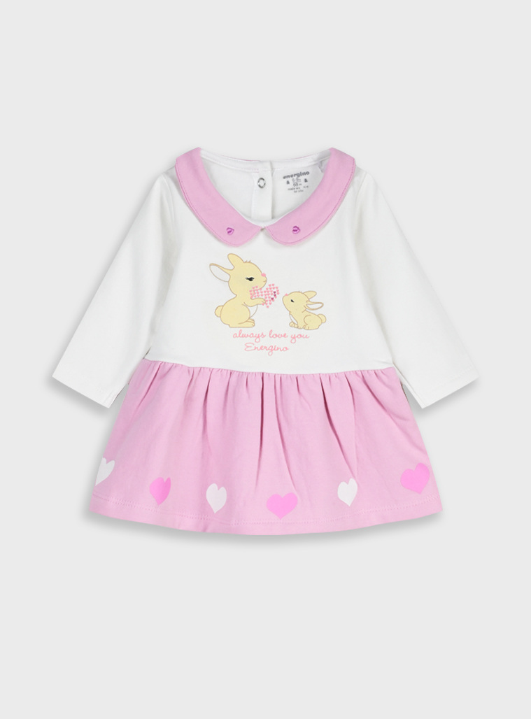 Cotton, floral dress combined with a fur vest. (0 – 12 Months)