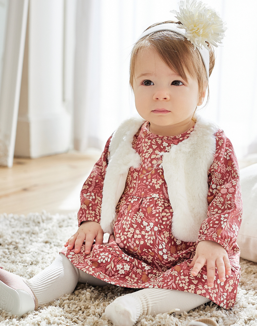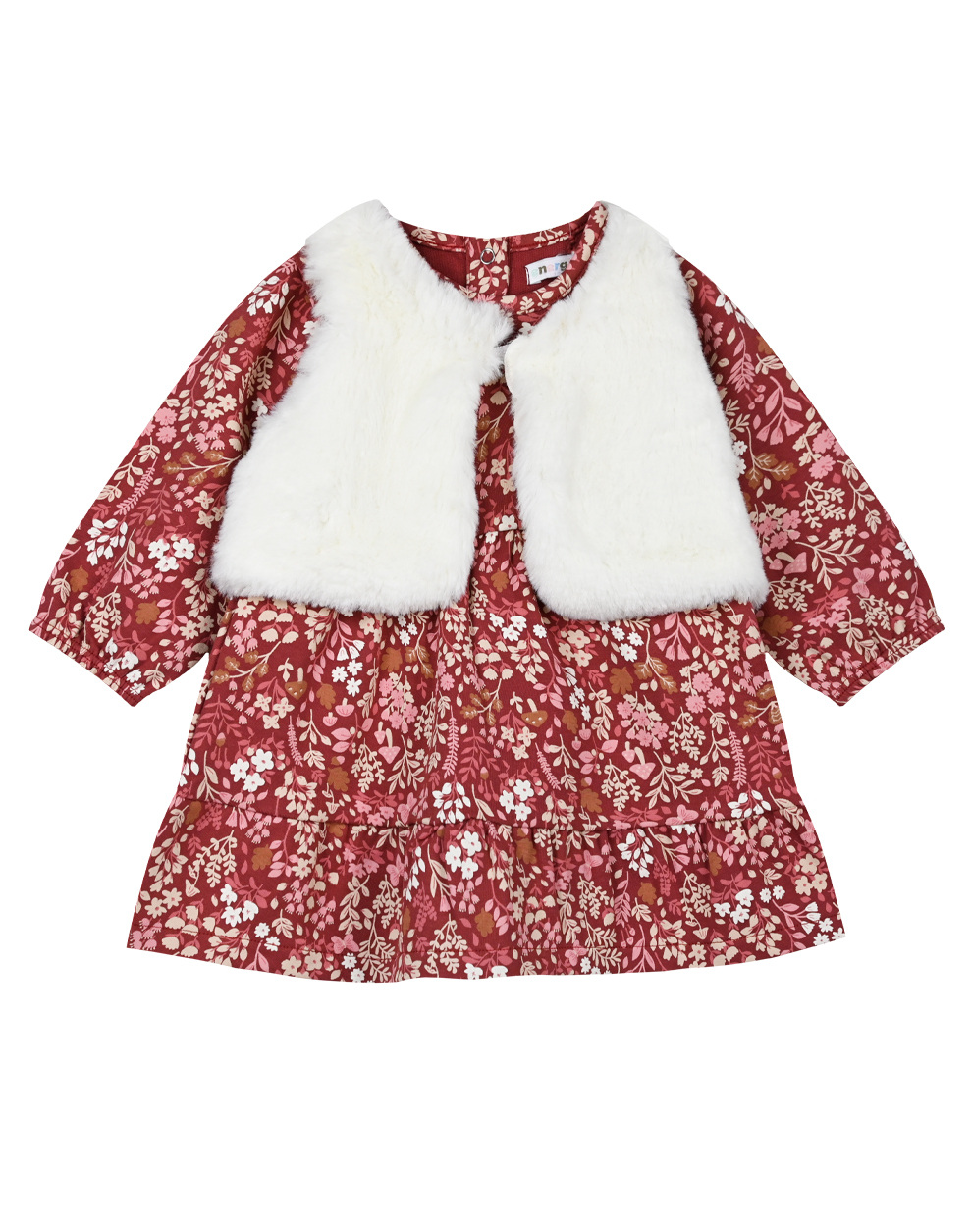HomeDress Cotton, floral dress combined with a fur vest. (0 – 12 Months)