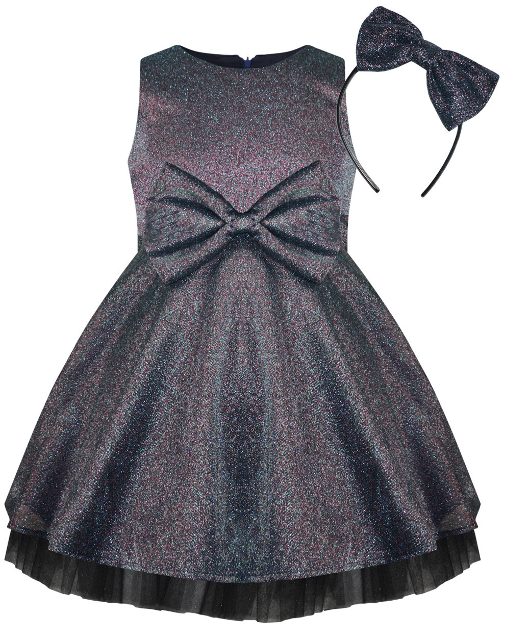 Φόρεμα από γυαλιστερή ύφανση με βολάν στα μανίκια, φιόγκο στη μέση και τούλι στο κάτω μέρος. Συνοδεύεται από ασορτί στέκα με φιόγκο