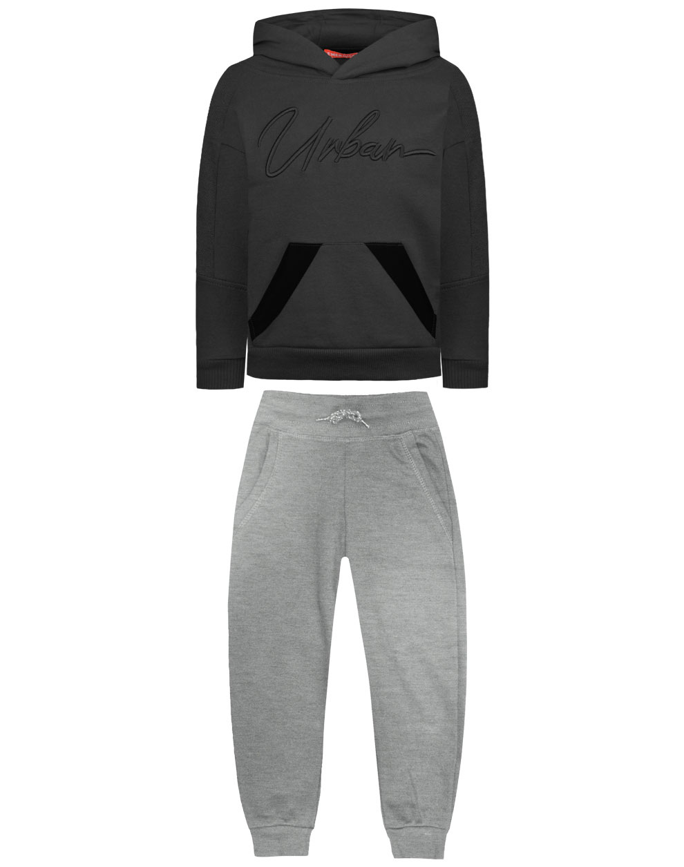 Φόρμα από αχνούδιαστο φούτερ. Η μπλούζα έχει κουκούλα, τύπωμα και καγκουρό τσέπη. Το παντελόνι έχει κορδόνι και τσέπες
