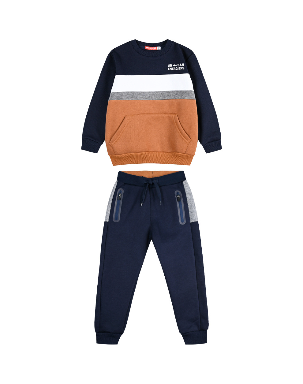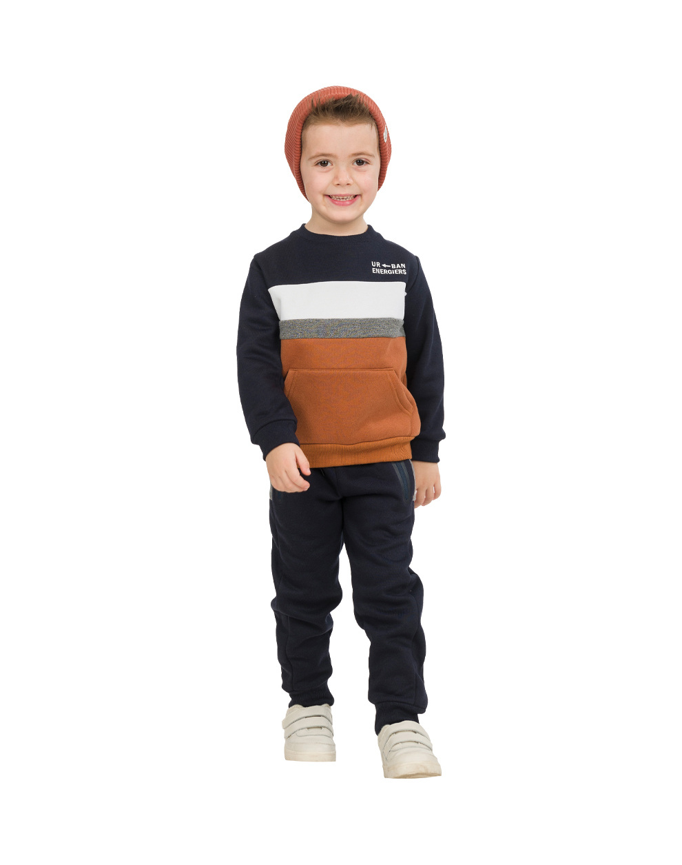 Φούτερ φόρμα για αγόρι. Η μπλούζα αποτελείται από 4 χρώματα και τσέπη καγκουρό. Το παντελόνι εχει τσέπες στο πλάι με φερμουαρ.