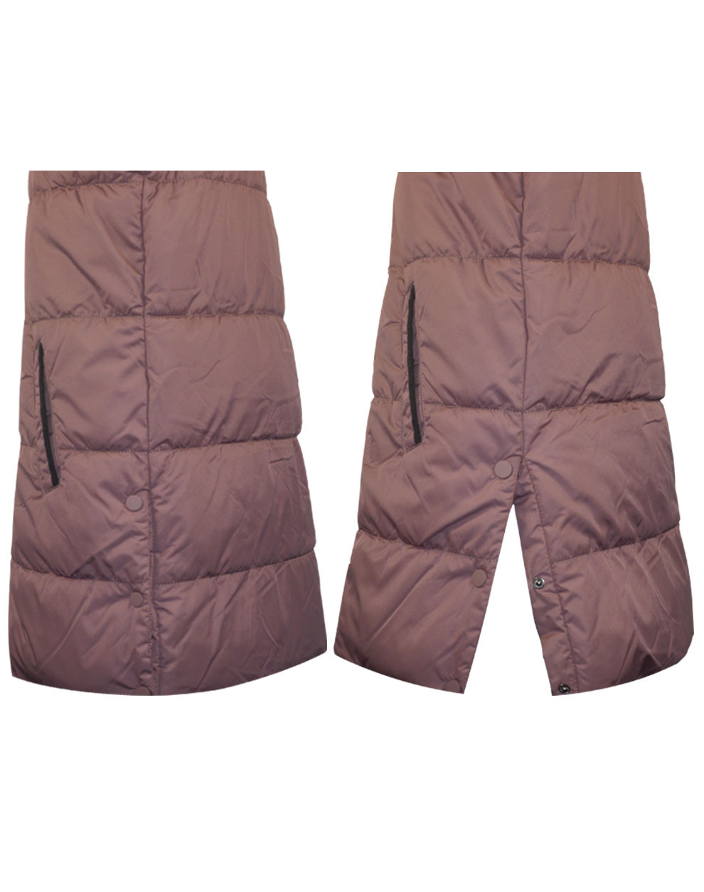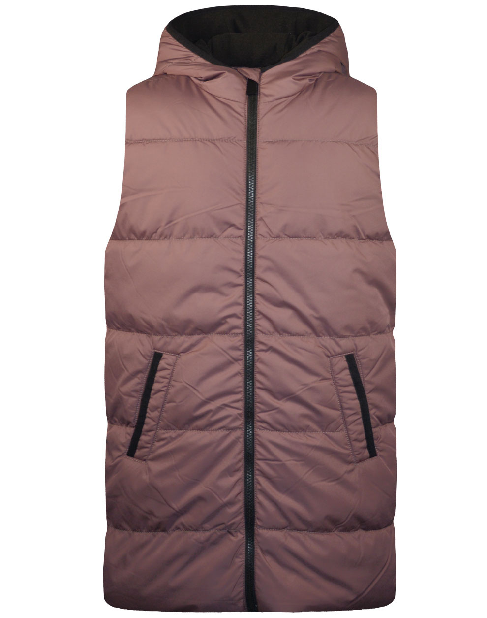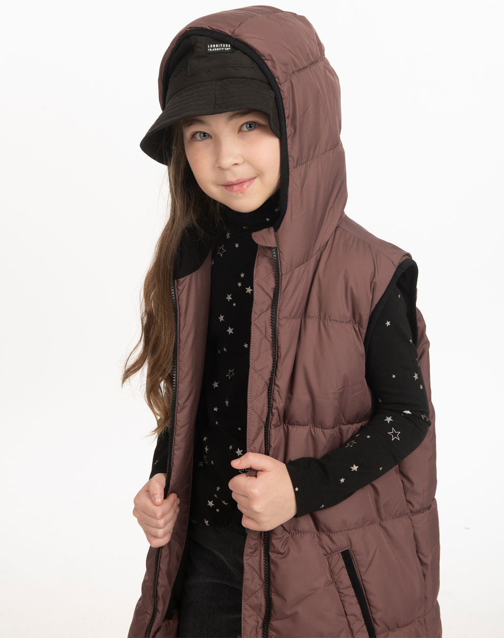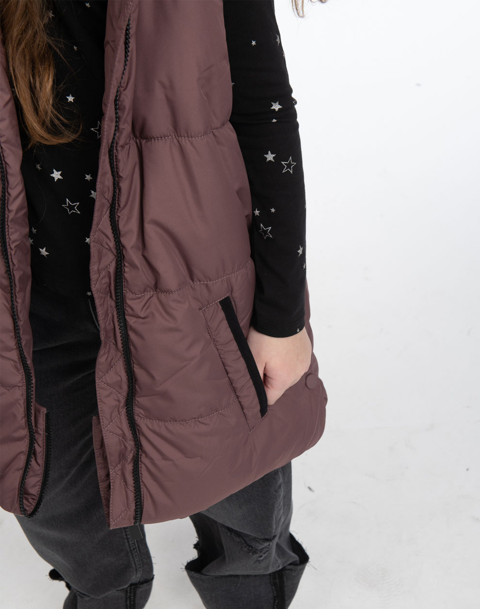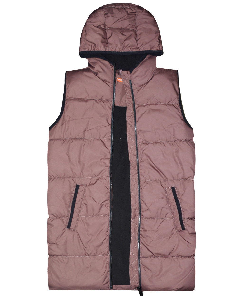 Μακρύ puffer αμάνικο γιλέκο με εσωτερική fleece επένδυση και κουκούλα για κορίτσι.