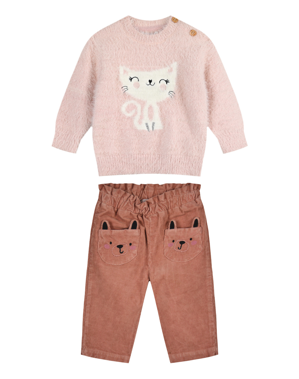Βρεφικό σετ με πλεκτή χνουδωτή μπλούζα με παντελόνι κοτλέ για βρεφικό κορίτσι (6 – 18 μηνών)